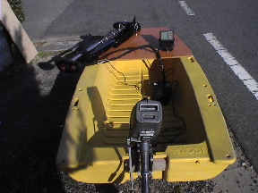 けんさんのオカモトMA430です。 フットエレキ・ハンドエレキ・魚探を装備した究極のゴムボートです。 これ以上のゴムボートはないでしょう! (こ、これで1万円とは・・。安すぎる) |