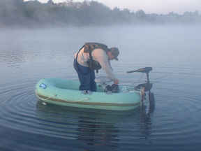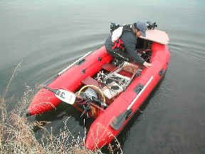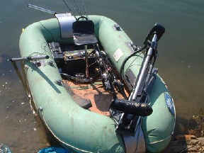 塩原のバサーさんのアキレスN4-321にハンドエレキを装着した画像です。まずマウントをセットし、そこにエレキを付けています。 野池最速のゴムボートです! |