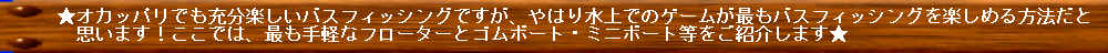 なんと言ってもフローターの利点は、野池等のオカッパリではどうしても攻め切れなかった場所を攻めることが出来るということです。 私も初めて浮いた時はあまりの釣果に驚いた覚えがあります。 |