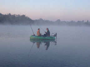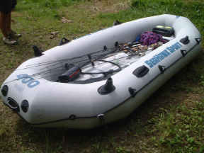 | けんさん所有のコールマンのゴムボートです。値段も6000円ぐらいと手軽で、意外と安定感もあります。私も買う予定です(笑) | 私が地元の野池で使っているINTEX社のシーホークです。価格も約1万円とそこそこで、かなり丈夫です。底がエアーなので疲れません。 |